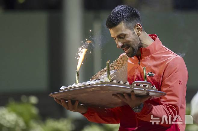 [제네바=AP/뉴시스] 노바크 조코비치(6위·세르비아)가 22일(현지 시간) 스위스 제네바에서 열린 남자프로테니스(ATP) 투어 제네바 오픈(ATP250) 단식 8강전에서 마테오 아르날디(39위·이탈리아)를 꺾은 후 케이크를 들고 생일과 승리를 자축하고 있다. 조코비치가 2-0(6-4 6-4)으로 승리하고 준결승에 올라 캐머런 노리(90위·영국)와 결승 진출을 다툰다. 2025.05.23.