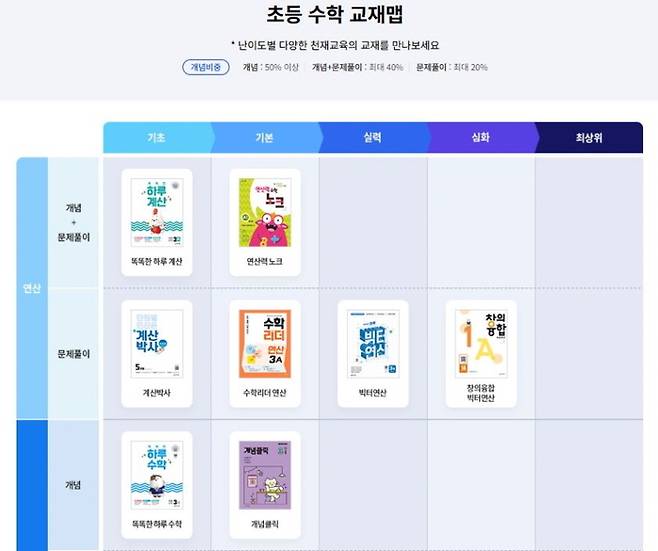 리뉴얼된 교재 선택 가이드는 모든 교재의 난이도, 개념, 유형 구성 비율을 표로 정리해 직관적인 비교를 가능하게 한다. 또한, 추천 대상, 교재의 특장점, 차별화 포인트 등 다양한 기준을 추가해 상세한 정보를 제공한다. 더불어 기존에는 온라인 서점으로 이동해야만 볼 수 있었던 미리보기 기능을 한 페이지에서 확인할 수 있도록 개선했다.