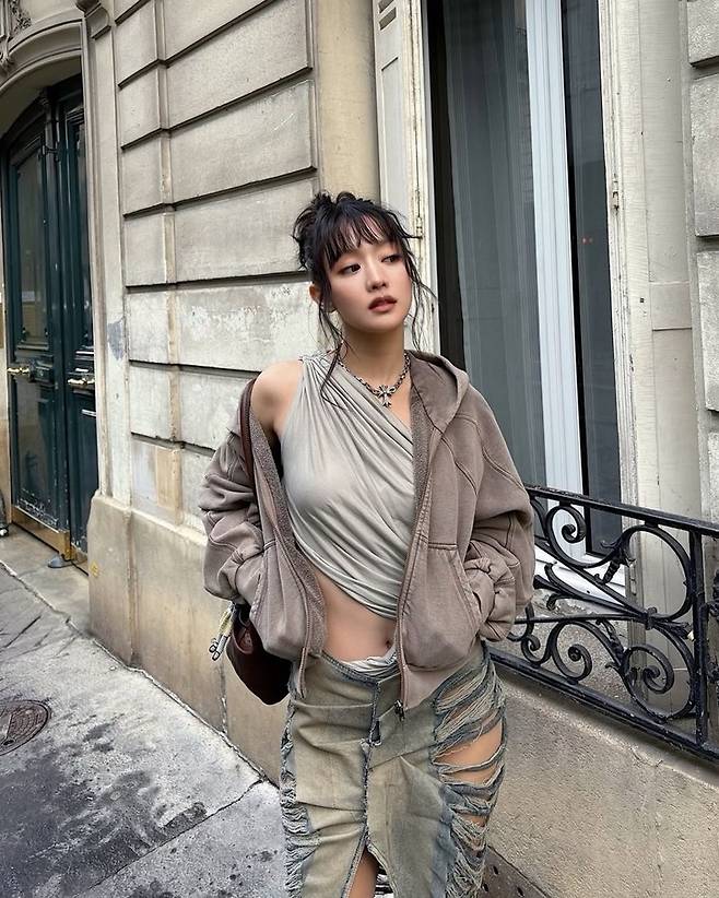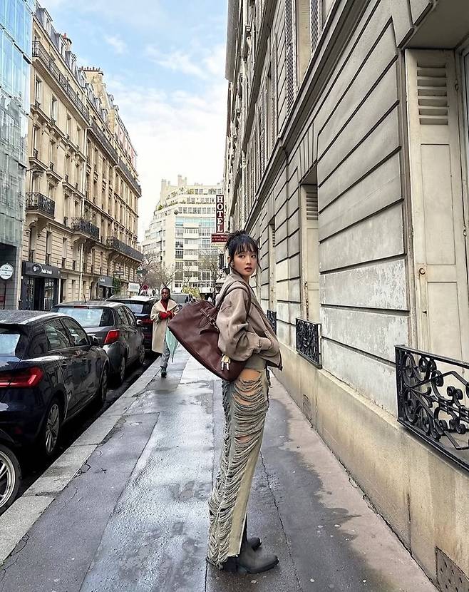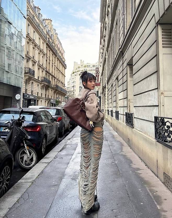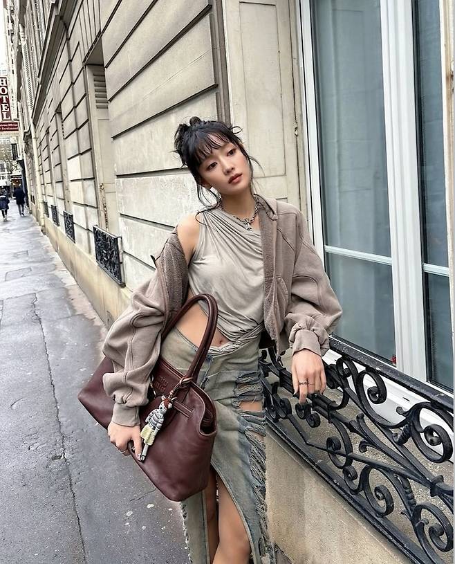 사진 속의 민니는 전반적으로 캐주얼하고 빈티지한 느낌의 '에포트리스 시크'룩의 베이스에 허벅지 위까지 찢어진 파격적인 디스트로이드 디테일의 롱 데님 스커트는 파리의 거리와 어울리면서도 민니의 강한 개성을 드러낸다.