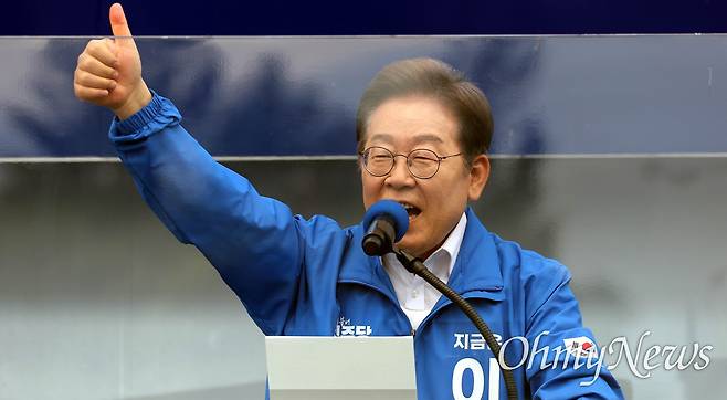 | ▲ 이재명 더불어민주당 대선후보가 22일 경남 양산 워터파크공원에서 열린 유세에서 손을 치켜들고 인사하고 있다. |