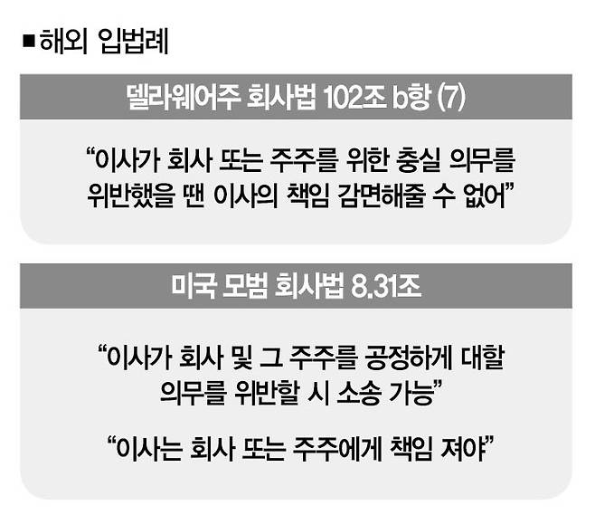 입법례는 또 있다. 미국 모범 회사법 8.31조 역시 이사가 '회사 및 주주'에 책임이 있다고 규정하고 있다. "이사가 회사 및 그 주주를 공정하게 대할 의무를 위반한 경우 관련법에 따라 소송이 가능하다. 이사는 회사 또는 주주에게 책임을 진다." 상법 개정안에 들어있는 '이사의 주주충실의무'를 규정한 입법례가 분명히 존재한다는 거다.