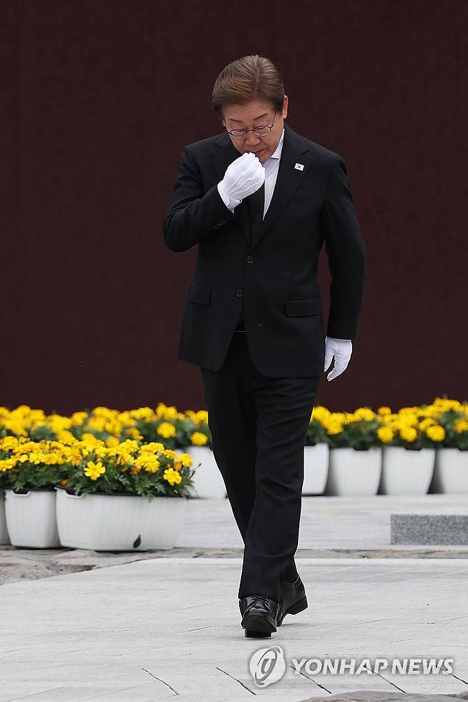 (김해=연합뉴스) 김인철 기자 = 더불어민주당 이재명 대선 후보가 23일 경남 김해시 진영읍 봉하마을을 방문해 노무현 전 대통령 묘역 참배 및 헌화를 마친 뒤 눈물을 훔치고 있다. 2025.5.23 [공동취재]