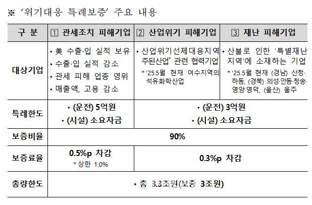 지운 대상은 △미국의 관세조치 및 경기침체로 인한 피해기업 △‘산업위기 선제대응지역’으로 지정된 여수시의 석유화학산업 관련 기업 △대규모 산불 발생으로 ‘특별재난지역’에 소재한 기업 등이며, 관련 피해가 확인되는 기업을 폭넓게 인정해 지원할 계획이다.
