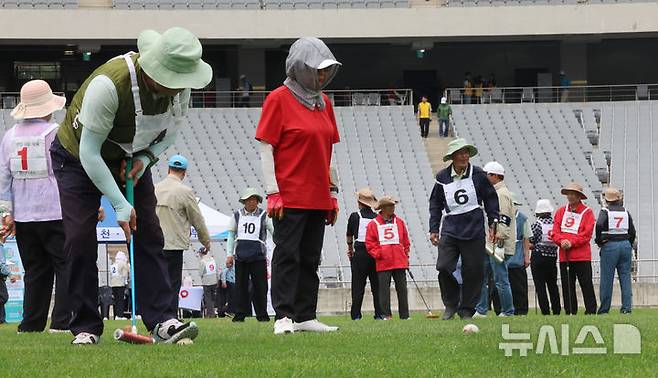 [인천=뉴시스] 전진환 기자 = 2025년 인천시장기 노인건강체육대회가 열린 23일 인천 서구 인천아시아드 주경기장에서 게이트볼에 출전한 선수들이 경기를 펼치고 있다. 2025.05.23. amin2@newsis.com