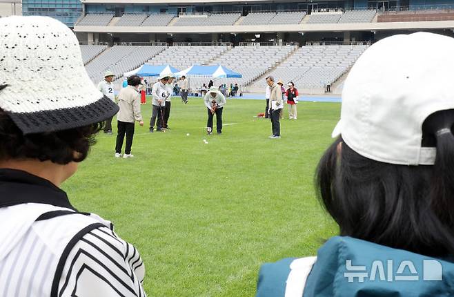 [인천=뉴시스] 전진환 기자 = 2025년 인천시장기 노인건강체육대회가 열린 23일 인천 서구 인천아시아드 주경기장에서 게이트볼에 출전한 선수들이 경기를 펼치고 있다. 2025.05.23. amin2@newsis.com