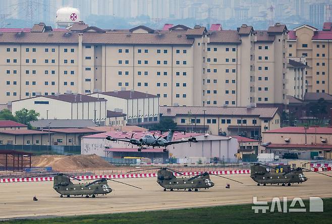 [평택=뉴시스] 정병혁 기자 = 23일 경기 평택시 캠프 험프리스에서 RC-12X 가드레일 정찰기가 이륙하고 있다. 도널드 트럼프 미국 행정부가 주한미군 수천명을 감축하는 방안을 논의 중이라고 현지언론이 보도했다.