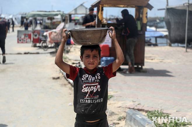 [가자시티=신화/뉴시스] 22일(현지 시간) 가자지구 가자시티의 식량 배급소에서 한 팔레스타인 소년이 무료로 받은 음식을 머리에 이고 가고 있다. 2025.05.23.