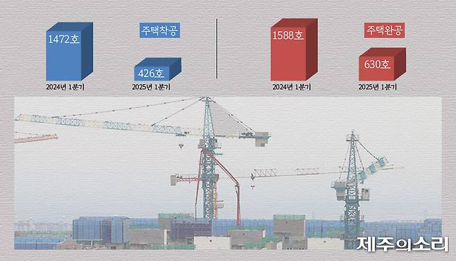 실제 올해 1분기 제주지역 주택건설 착공 실적은 426호로 지난해 같은 기간 1472호와 비교해 71%나 감소했다. 같은 기간 인허가 물량은 959호에서 341호로 3분의 1수준이 됐다.