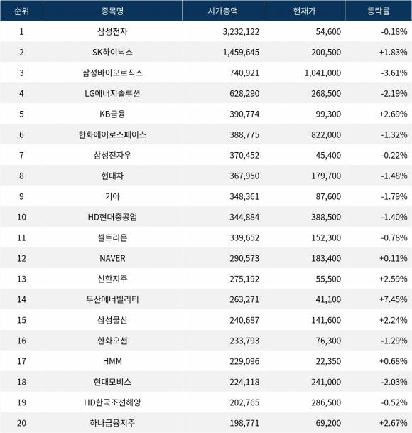 한편 시가총액 20위권 종목들은 셀트리온(068270) ▼0.78%, NAVER(035420) ▲0.11%, 신한지주(055550) ▲2.59%, 두산에너빌리티(034020) ▲7.45%, 삼성물산(028260) ▲2.24%, 한화오션(042660) ▼1.29%, HMM(011200) ▲0.68%, 현대모비스(012330) ▼2.03%, HD한국조선해양(009540) ▼0.52%, 하나금융지주(086790) ▲2.67% 등의 성적을 기록하고 있다.