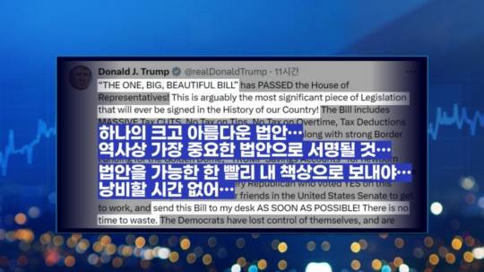 시장의 우려에 아랑곳하지 않고 트럼프 대통령은 이번 법안 통과에서 고무된 입장을 냈습니다. SNS에 "법안을 가능한 한 빨리 내 책상으로 보낼 시간이고 낭비할 시간이 없다"면서 상원을 압박했습니다.