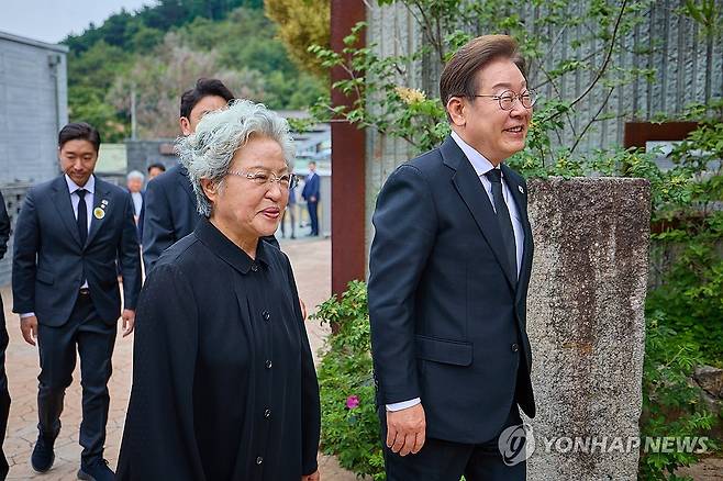 (서울=연합뉴스) 더불어민주당 이재명 대선 후보가 고 노무현 전 대통령 16주기 추도식이 열린 23일 경남 김해시 봉하마을에서 권양숙 여사와 만나 함께 걸어가고 있다. 2025.5.23 [더불어민주당 제공. 재판매 및 DB금지]