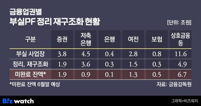 금융감독원에 따르면 부동산PF 사업성 평가를 통해 저축은행업권 부실 사업장으로 분류된 규모는 지난해 말 기준 4조5000억원 규모다. 이 가운데 3월말 기준 정리·재구조화된 사업장은 1조9000억원, 6월말까지 정리·재구조화가 예정된 사업장 규모는 1조7000억원으로 예상된다.
