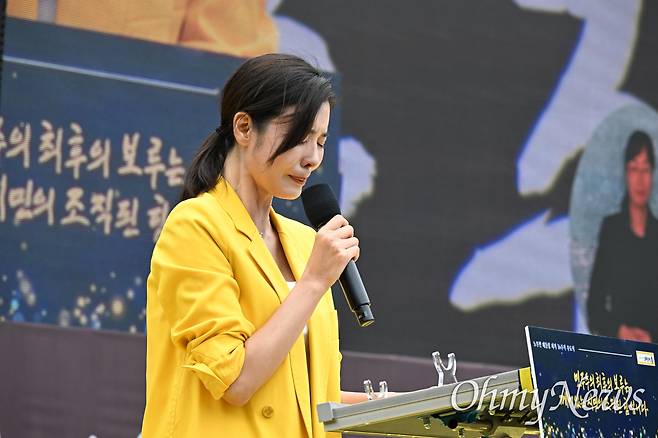 | ▲ 노무현 전 대통령 서거16주기 추도식이 2025년 5월 23일 오후 김해시 진영읍 본산리 봉하마을에서 열렸다.권양숙여사,문재인 전 대통령과 김정숙 여사,아들 노건호 씨,우원식 국회의장 등이 묵념하고 있다. 사회자 김규리 배우가 눈물을 보이고 있다. |