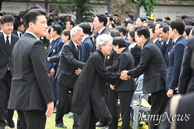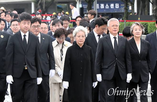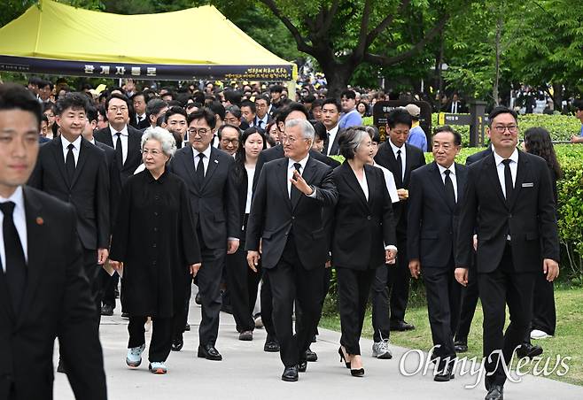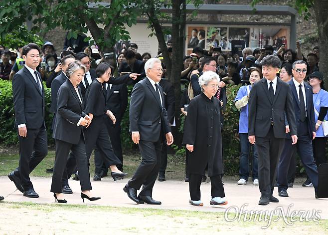 | ▲ 노무현 전 대통령 서거16주기 추도식이 2025년 5월 23일 오후 김해시 진영읍 본산리 봉하마을에서 열렸다.권양숙여사,문재인 전 대통령과 김정숙 여사,아들 노건호 씨,우원식 국회의장 등이 대통령 묘역을 참배하기 위해 이동하고 있다. |