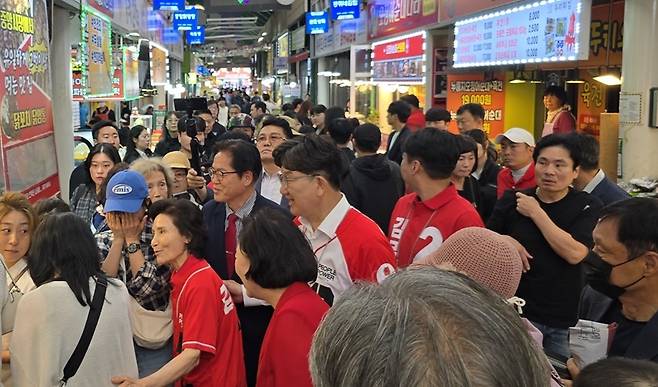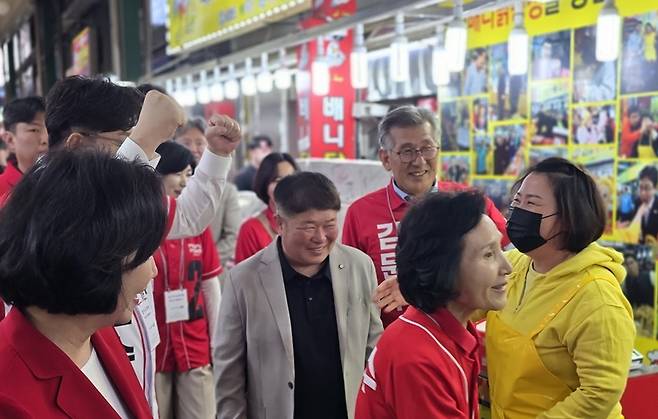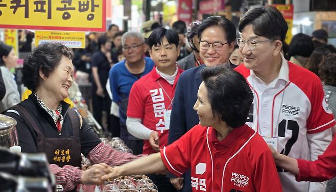 | ▲ 23일 강원 강릉 중앙시장을 찾은 국민의힘 김문수 후보 배우자 설난영 여사가 권성동 원내대표와 함께 상인들과 인사를 나누고 있다. |