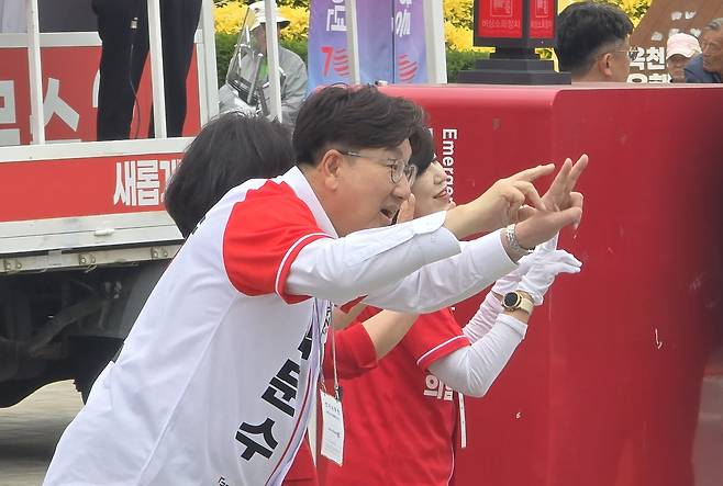 | ▲ 23일 강원 국민의힘 김문수 후보 배우자 설난영 여사가 강원 강릉 중앙시장 방무을 앞둔 가운데, 먼저 도착한 권성동 원내대표가 지나가는 차를 향해 지지를 호소하고 있는 모습 |