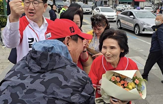| ▲ 23일 강원 강릉 중앙시장 유세에 나선 국민의힘 대통령 후보 김문수 후보의 배우자 설난영 여사가 유세장에 도착하자 관계자가 미리 준비한 꽃다발을 전하고 있다. 권성동 원내대표는 옆에서 "김문수 대통령"이라는 구호를 외치고 있다. |