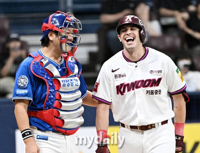 키움 히어로즈의 외국인 타자 루벤 카디네스가 공에 맞았지만 끝까지 웃음을 잃지 않았다. 22일 오후 서울 고척동 고척스카이돔에서 진행된 '2025 KBO리그' 키움히어로즈와 삼성라이온즈의 경기.
