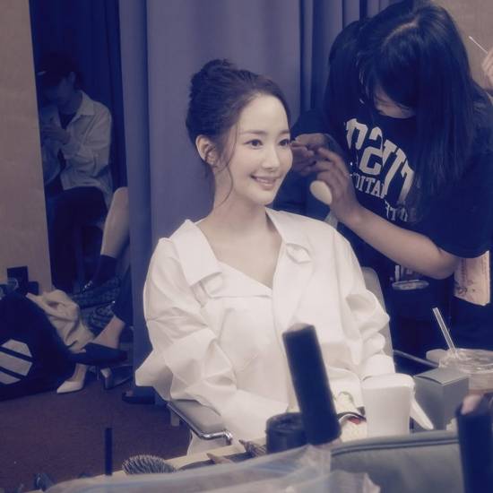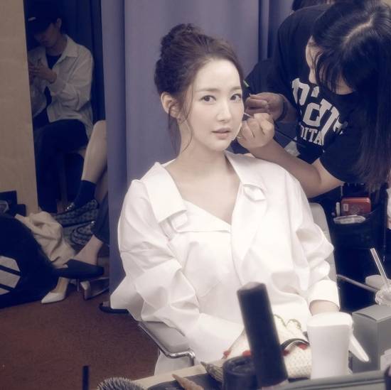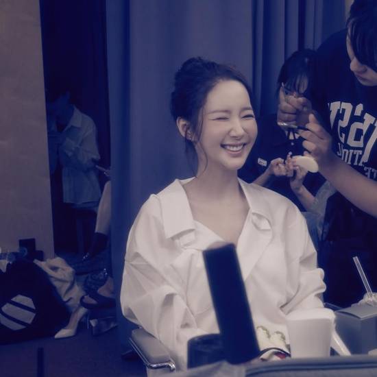 공개된 사진 속 박민영은 촬영 준비 중 메이크업을 받으며 카메라를 응시하고 있다. 정갈하게 묶은 머리와 흰색 셔츠 차림이 단정한 분위기를 자아내며, 은은한 조명 아래 청초한 미모가 돋보인다.