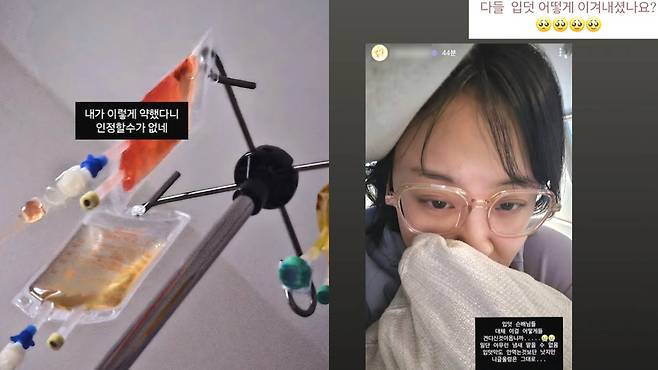 지난 22일 손민수는 개인 계정을 통해 병원에서 링거를 맞고 있는 모습을 공개하며 "내가 이렇게 약했다니 인정할 수가 없네"라는 글을 남겼다.