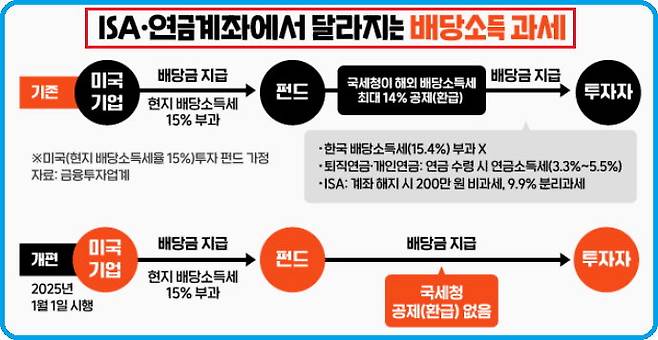 하지만 올해 2025년부터는 외국납부세액을 먼저 환급해 주는 제도가 폐지되었다. 연금계좌를 통해 해외ETF에 투자할 경우 외국에서의 세금을 차감한 금액이 재투자되기에 종전에 비해 재투자금액에 줄어들게 된 것이다. 그럼에도 불구하고 연금계좌는 세액공제와 과세이연 효과로 인해 노후자금 마련을 위한 강력한 투자수단임에는 틀림이 없다.