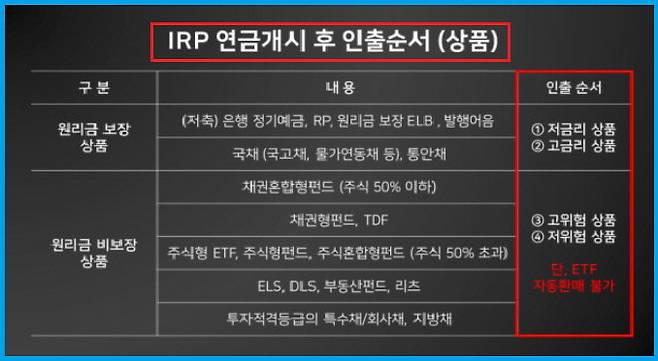 마지막으로 원리금보장이 되지 않는 실적배당 금융상품으로는 펀드, 초 저위험군을 제외한 디폴트옵션 상품, 채권 등이 있다. 이들 상품을 매도할 때에도 저위험상품부터 고위험상품 순서로 하는 것이 원칙이지만 세부적인 내용은 금융회사 내부기준에 따른다. ETF나 리츠는 자동적으로 매도가 안 되기 때문에 가입자가 직접 매도해야 한다. 원활하게 연금을 지급하기 위해서는 금융회사가 연금수령일보다 10~15일 전에 인출금액을 확정하고 매도를 진행하는 경우가 많기에 이 역시 고려해야 할 부분이다.
