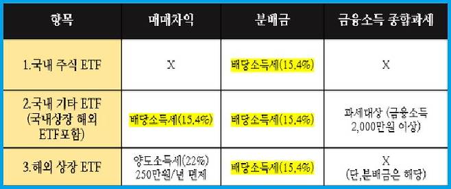 다만 매매차익에 대한 과세는 각기 다르다. 국내주식형ETF는 국내 상장주식 투자와 마찬가지로 세금이 없다. 그러나 채권 등에 투자하는 기타ETF는 배당소득세(15.4%)가 과세되고, 해외상장ETF는 해외주식 투자처럼 양도소득세(22%)가 과세된다. 세액공제나 과세이연 효과를 누리려면 연금계좌를 활용하면 된다.