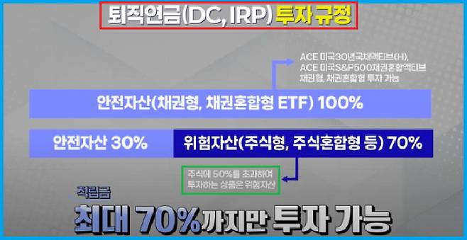 다만 IRP에서 투자를 이어갈 경우 위험자산 투자한도를 살펴야 한다. IRP가입자는 적립금 중 70%까지만 위험자산에 투자할 수 있다. 주식비중이 50%이상인 펀드와 ETF, 하이일드 채권펀드, 리츠 등이 위험자산에 포함된다. 나머지 30%는 원리금 보장상품, 주식비중이 50%미만인 펀드와 ETF 혹은 적격TDF나 디폴트옵션 상품에 투자해야 한다. 연금저축펀드 가입자는 이와 같은 위험자산 투자한도를 적용받지 않고 투자할 수 있다.