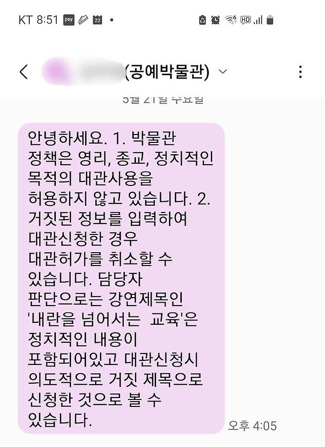| ▲ 서울공예박물관 대관 담당자로부터 받은 문자 내용 서울공예박물관 대관 담당자가 다음과 같이 문자를 보냈다 |