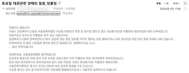 | ▲ 서울공예박물관 대관 담당자로부터 받은 메일 서울공예박물관 대관 담당자가 다음과 갗은 이유로 대관 취소를 알려왔다. |