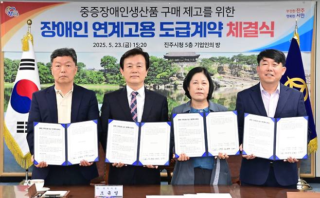 경남 진주시는 23일 시청 기업인의 방에서 중증장애인생산품과 표준사업장 구매제고 및 장애인 고용과 장애인고용 부담금 감면 효과를 위해 장애인직업재활시설인 3개 시설과 ‘장애인 연계고용 도급계약’을 체결했다.