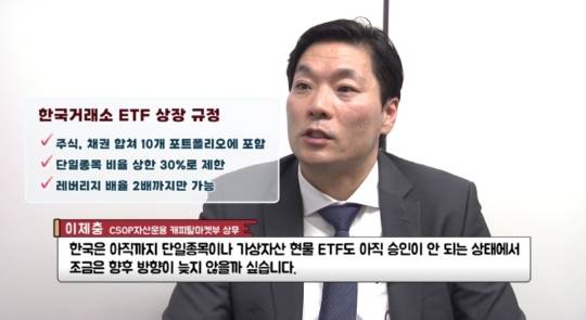 국내 대표 기업인 삼성전자 단일종목 ETF가 한국거래소가 아닌 홍콩에서 출시되는 건 국내의 자본시장 규제 때문입니다. 금융투자업 규정상 채권은 3종목, 주식은 10종목 이상 ETF에 담도록 강제하고 있어 국내 자산운용사는 한 종목만 담은 ETF를 출시할 수 없습니다. 종목당 비중이 30%를 넘어서도 안 되고 레버리지 배율도 2배까지만 상장할 수 있습니다.
