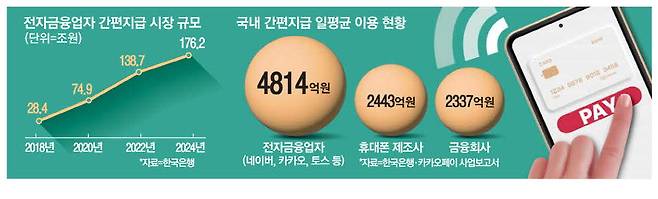 23일 한국은행 등에 따르면 국내 간편지급(간편결제) 서비스 시장의 일평균 이용 금액은 지난해 기준 9594억원에 달한다. 이 중 네이버페이, 카카오페이, 토스페이 등 전자금융업자가 일평균 4814억원, 휴대폰 제조 회사(삼성페이·애플페이 등)가 일평균 2443억원, 금융회사(카드사·은행 등)가 일평균 2337억원을 담당하고 있다. 전자금융업자가 간편지급 시장의 50.7%를 차지하고 있는 셈이다.