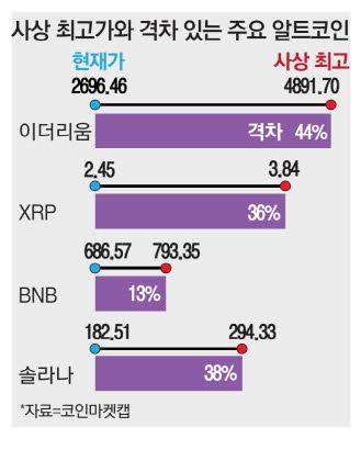 단 알트코인의 경우 사상 최고가와 여전히 격차가 많이 남아 있는 상태다.