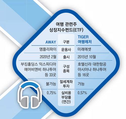 이들 여행 관련주에 분산 투자하기 좋은 ETF가 있다. 글로벌 분산 투자자에겐 AWAY가 제격이다. 차량공유 업체 우버, 부킹홀딩스, 중국 넘버원 OTA 트립닷컴, 공유숙박 플랫폼 에어비앤비 등이 3~4%대 비중으로 투자돼 있다. 하나투어 역시 3.09%의 비중으로 담고 있다.