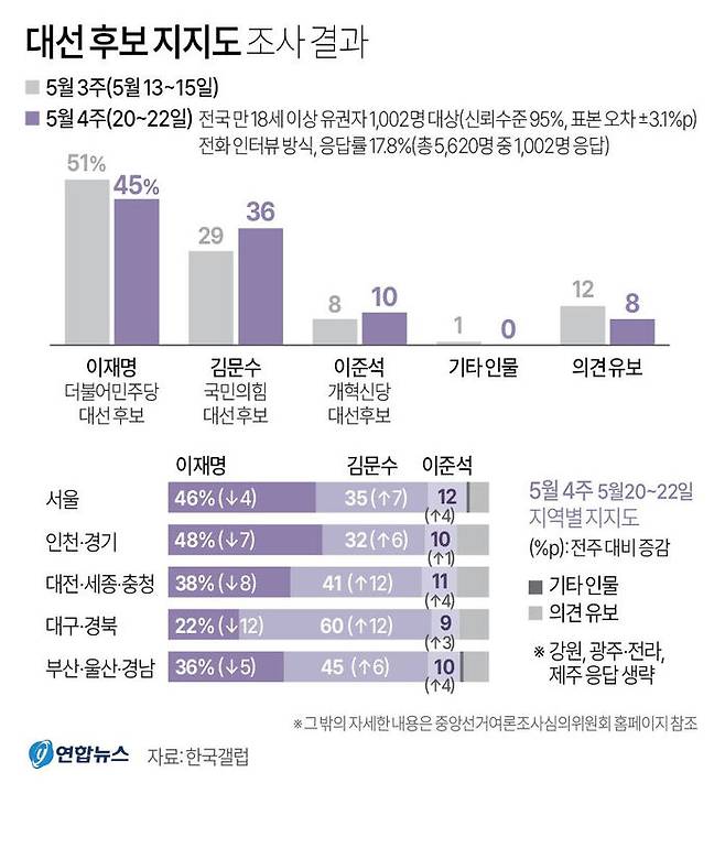 이재명 45%·김문수 36%·이준석 10% <한국갤럽>