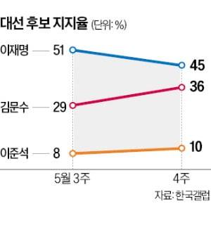 한국갤럽이 지난 20~22일 전국 만 18세 이상 유권자 1002명을 대상으로 조사(95% 신뢰수준에 표본오차 ±3.1%포인트)해 23일 발표한 여론조사에 따르면 김 후보 지지율은 전주보다 7%포인트 오른 36%를 기록했다. 1위인 이재명 후보(45%)에게는 9%포인트 뒤져 오차범위 밖 격차가 유지됐지만 한 주 전 22%포인트 차로 밀리던 것과 비교하면 상승세가 뚜렷했다.