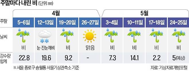 올해는 봄이 시작하는 3월부터 주말마다 비가 오고 있다. 이번 주말 비 소식을 포함해 서울에서는 3~5월 주말 13번 가운데 10번 비가 관측됐다. 4~5월엔 주말 8번 중 한 주를 제외하고 모두 비가 내렸다. 지난해 3~5월엔 주말 12번 중 6번 비가 온 것과 대조된다.