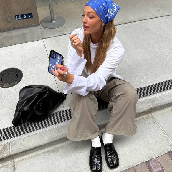 카고 바지의 장점은 요란하지 않은 주머니 장식 덕분에 티셔츠 하나만 매치해도 쉽게 세련된 스타일링을 완성할 수 있다는 것이에요. 독일의 인플루언서 린다 처럼 원 포인트 컬러를 정해 모자나 슈즈 등에 액세트를 더해봐도 좋겠네요.
