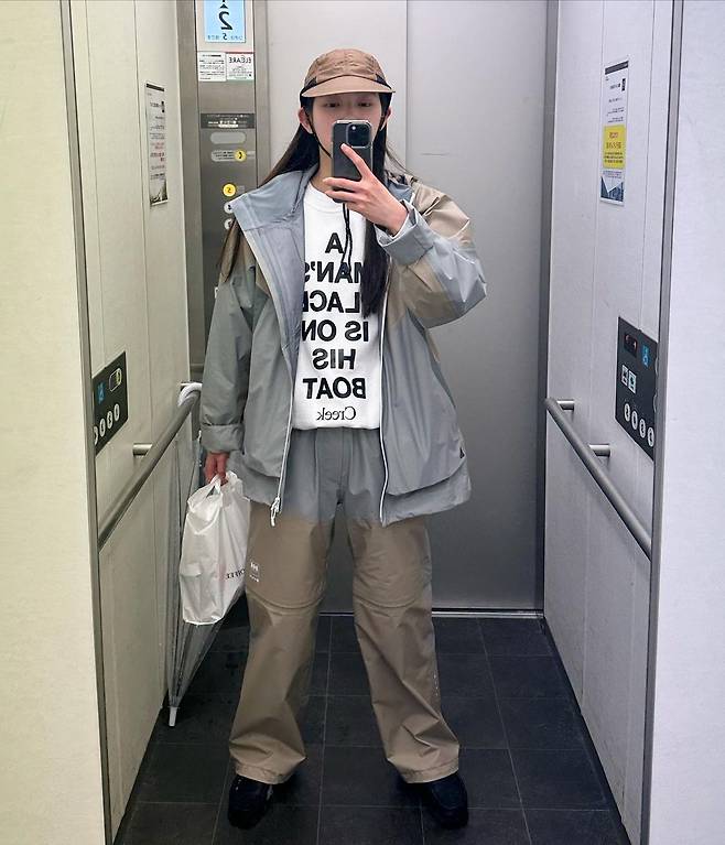 2025년 버전 카고 바지의 특징은 옆 라인이 주름이 잡혀 있다는 것입니다. 마치 스노우보드 바지를 입은 것처럼 발 끝에서 Y자 주름이 잡히는 실루엣이 특징! 여기에 디지털 인플루언서 마를린 엘리자베스 가 입은 것처럼 심플한 티셔츠를 레이어링하여 매치해봐도 좋겠어요.