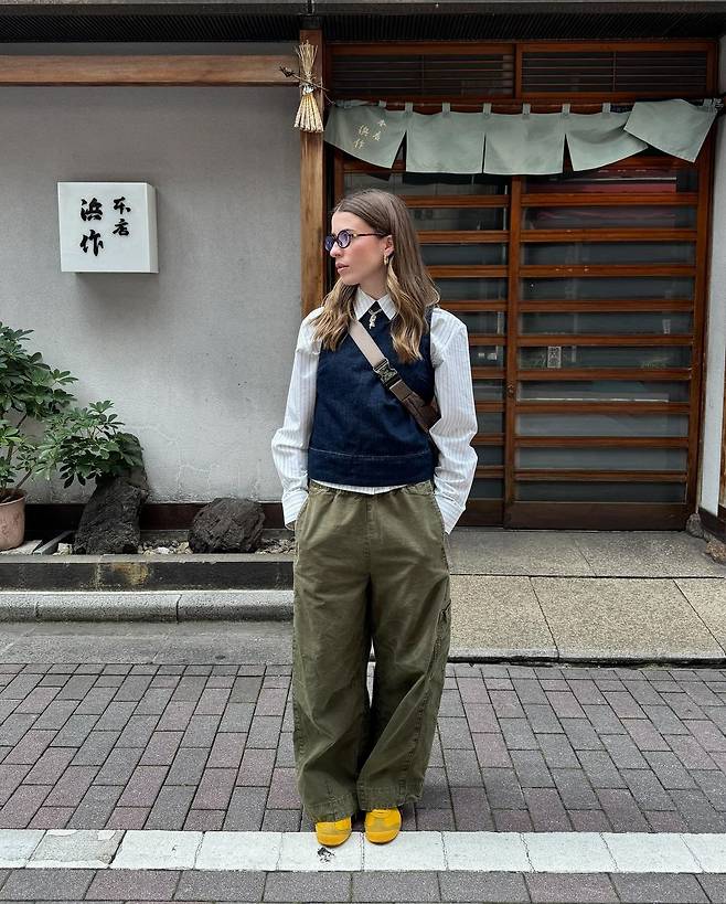 상의는 단정한 스트라이프 셔츠와 베스트, 안경으로 너디하게 연출한 반면 하의는 군복을 연상시키는 카키색의 카고 팬츠를 입은 샬럿 올리비아 . 지루할 틈이 없는 패션 월드에서 믹스 앤 매치의 재미란 바로 이런 거겠죠?