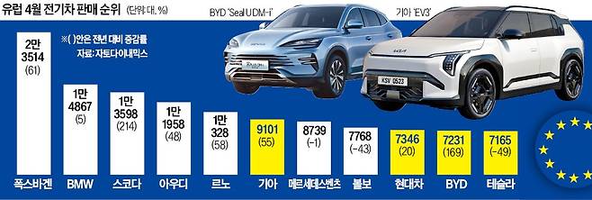 현대차·기아도 그중 하나다. 기아는 지난달 유럽에서 1년 전보다 55% 급증한 9101대를 팔며 전기차 판매 6위에 올랐다. 현대차도 같은 기간 20% 증가한 7346대 전기차를 팔아 9위를 차지했다. 지난 3월(기아 8위·현대차 11위)에서 두 계단씩 뛰어올랐다.