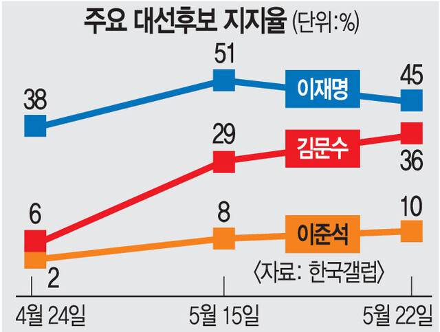 한국갤럽이 지난 20∼22일 전국 만 18세 이상 유권자 1002명을 대상으로 조사(95% 신뢰수준에 표본오차 ±3.1%포인트)한 결과, 이재명 후보의 대선 후보 지지도는 45%, 김 후보는 36%, 이준석 후보는 10%로 집계됐다. 이재명 후보는 직전 조사 대비 6%포인트 하락했고, 김 후보와 이 후보는 각각 7%포인트와 2%포인트가 올랐다.