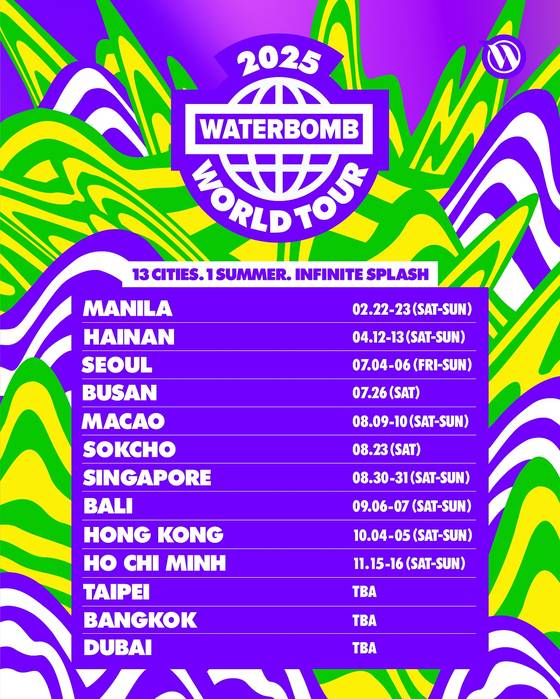 여름을 대표하는 뮤직 페스티벌 워터밤(WATERBOMB)이 2025년 본격적인 월드투어확장에 나서며 서울, 부산, 속초를 포함한 국내외 총 13개 도시에서 개최를 확정했다.
