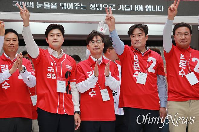 | ▲ 김용태 국민의힘 비상대책위원장 겸 공동선거대책위원장이 23일 부산 부산진구 서면에서 김문수 대선 후보 지원 집중유세를 펼친 가운데, 박수영 국회의원이 손을 들어 2번 지지를 강조하고 있다. |