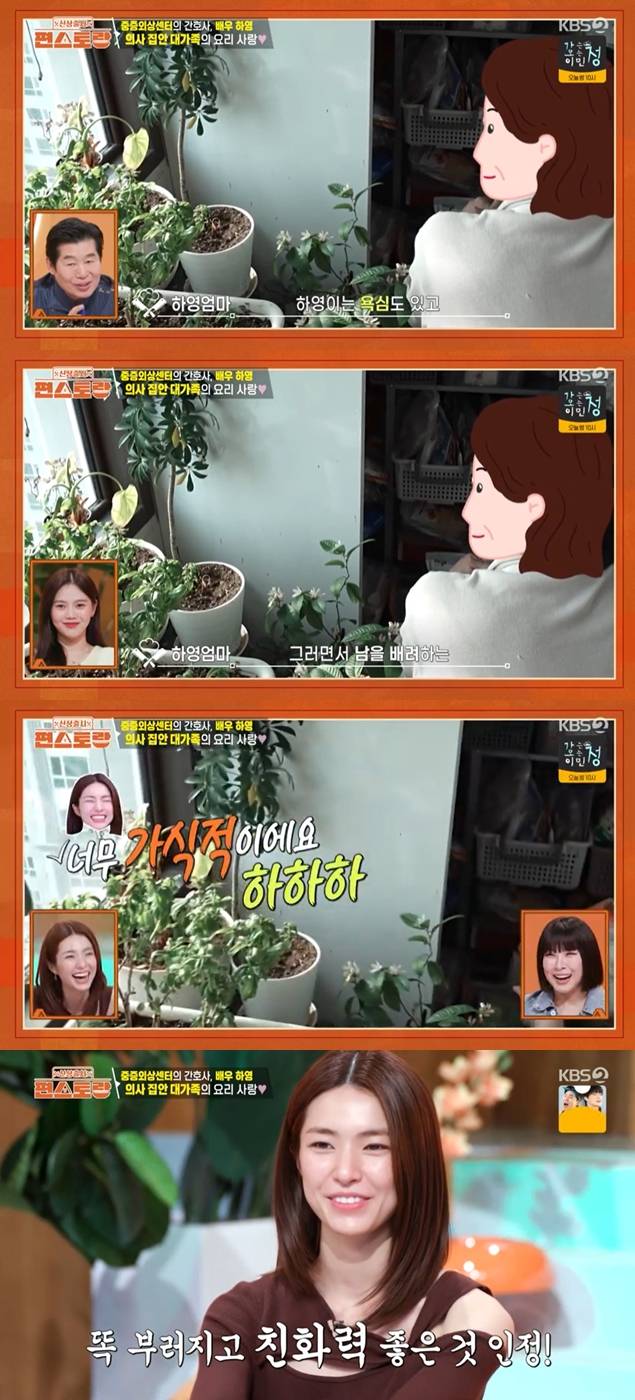 이를 본 정영주는 하영에 관해 "옛날 말로 하면 엄친딸이다. 성격도 밝고 호탕하고 유쾌하고 명량하고 요리도 잘하고 약간 반칙캐, 사기캐다"라고 말했다.