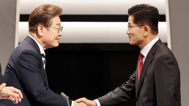 ▲ 더불어민주당 이재명 대선후보와 국민의힘 김문수 대선후보가 23일 서울 영등포구 여의도 KBS 스튜디오에서 열린 제21대 대선 2차 후보자 토론회에 앞서 인사하고 있다.