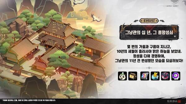 대사저 귤복복을 도와 그냥관을 경영하고 부흥시키는 이벤트다. 방부를 파견해 경영 물자를 파밍할 수 있으며, 상품을 판매하고 얻은 구름문으로 여러 보상과 교환할 수 있다.