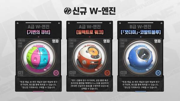 명파 특성 A급 W 엔진 기변의 큐브와 일렉트로 워크, B급 W 엔진 잿더미 코발트블루가 추가된다.