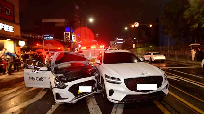 이 사고로 A 씨가 몰던 택시에 타고 있던 승객 3명 등 모두 5명이 다친 것으로 파악됐습니다.